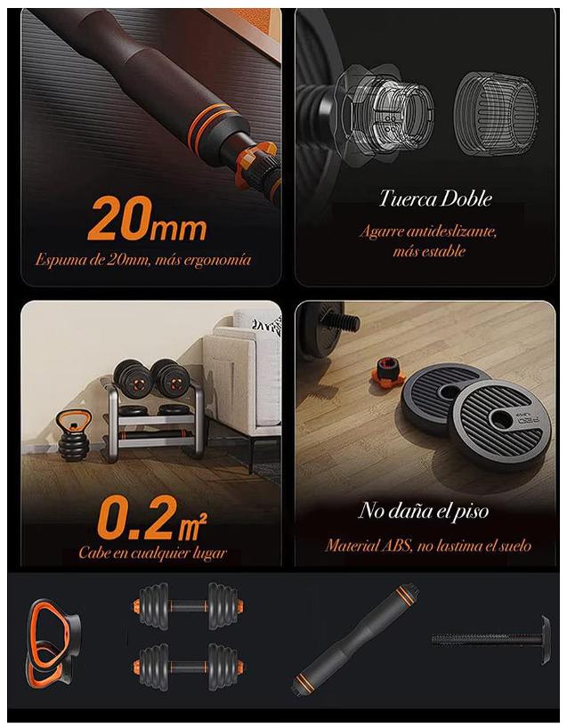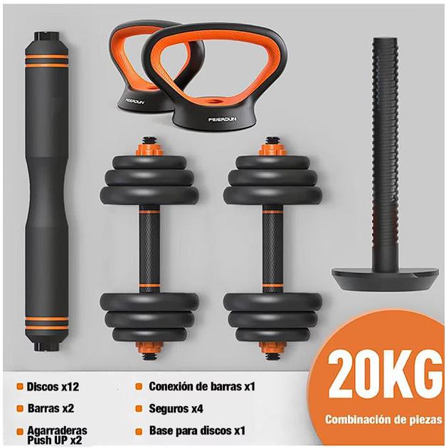 de pesas multiusos ideales para entrenar en casa gracias a su diseño compacto y materiales de alta calidad se convertirá en tu mejor aliado para lograr tus objetivos. 6 en 1 20 kg. Agarraderas pushup 2. . Seguros 4. . Barra mancuernas 2. . Extensible para barra acolchonada 1. . Base pesa rusa 1. . Discos 12. . 4 Discos 1.25k. . 4 Discos 1.50k. . 4 Dicos 2k.
