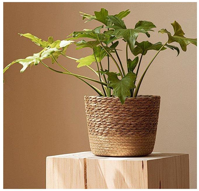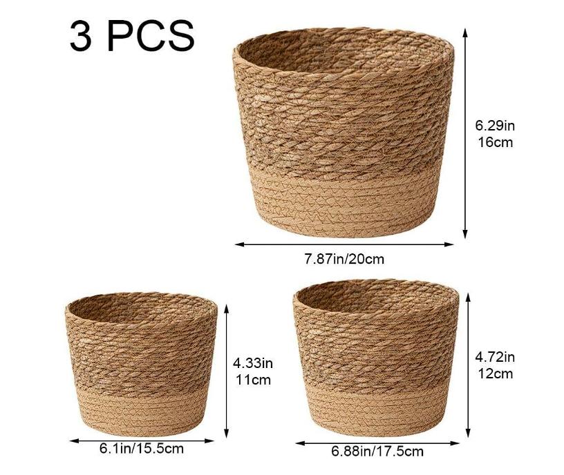 Estas cestas vienen en 3 tamaños para brindarte libertad creativa de decorar tu lienzo interior.Esta canasta para cubrir macetas está tejida a mano con materiales de césped natural, útil y liviana, segura de usar y preserva apariencia natural del césped.