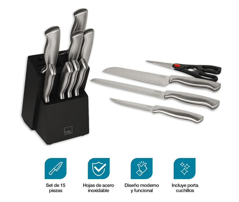 EL MÁS COMPLETO SET DE CUCHILLOS PARA TU COCINA (15 PIEZAS): Expande tus habilidades culinarias con la variedad que te ofrece este set: un cuchillo de chef, un cuchillo estilo santoku, un cuchillo para carne, un cuchillo multiusos, un cuchillo dentado, 6 cuchillos para rebanar, un cuchillo para pelar y unas tijeras