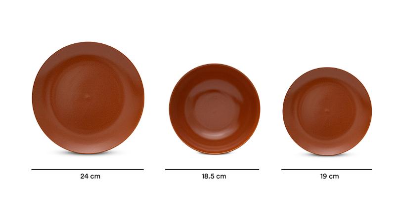 Este set incluye 12 piezas, ideal para 4 personas, que consta de: 4 platos de 24 cm, 4 platos de 19 cm y 4 bowls, con medidas de 18.5 cm.