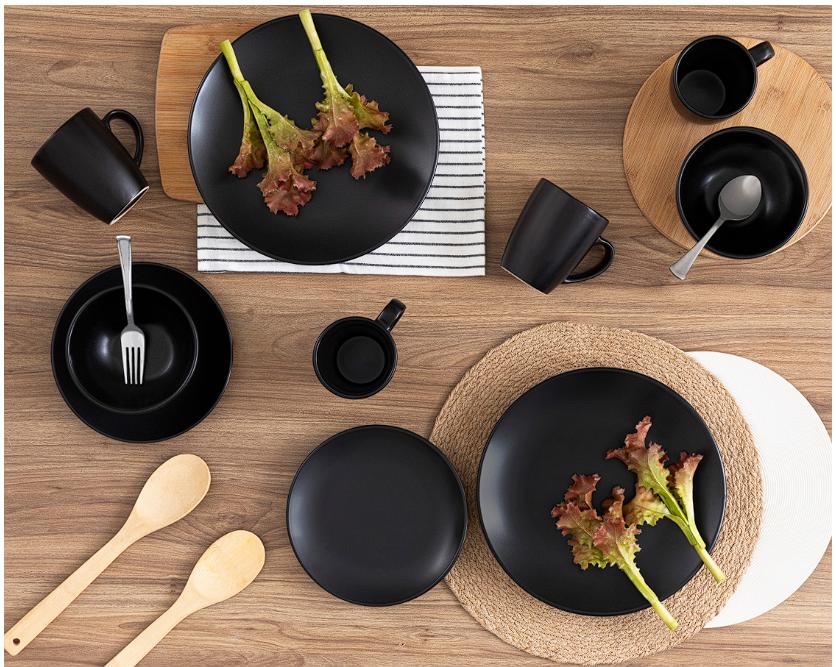 El modelo Negroni cuenta con 16 piezas, entre las que se encuentran 4 platos trinche, 4 para ensalada, 4 bowls y 4 tazas. Su acabado mate y color negro le añade personalidad a tu mesa y hace que los alimentos destaquen por sus colores, así sean más apetecibles para tu familia.
