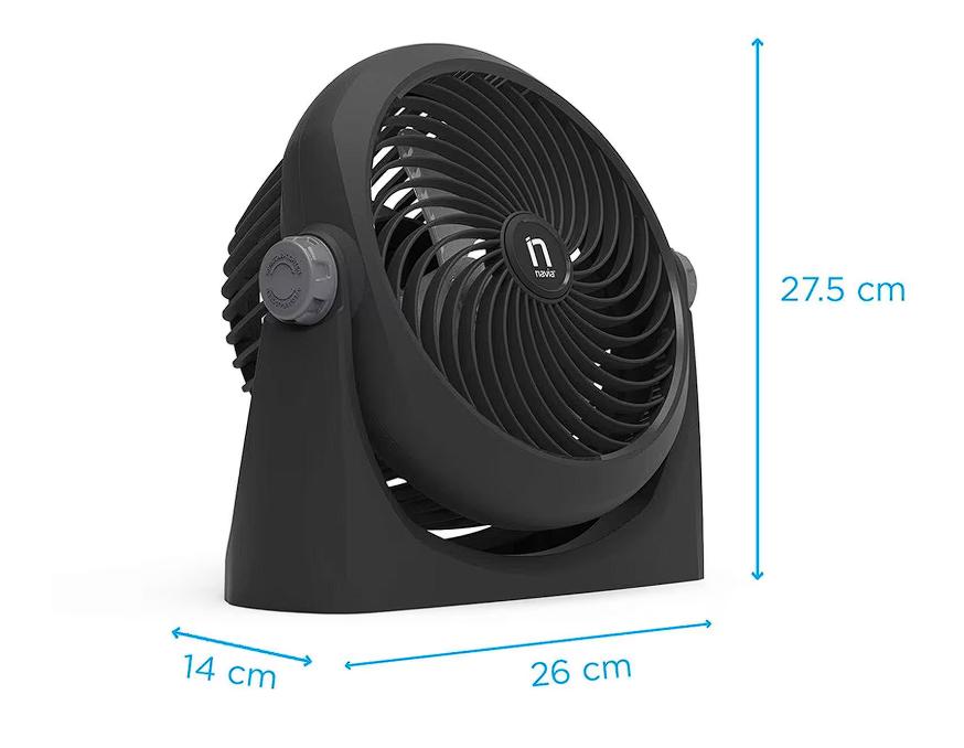Su diseño es en color negro con gris, un tono que combina muy bien con la decoración de tu espacio. Tiene un diámetro de 10" y el flujo de aire es de 11 m3/minuto. Cuenta con 3 aspas plástica, material resistente, y 3 velocidades. El motor es de cobre, por lo que es práctico y silencioso.