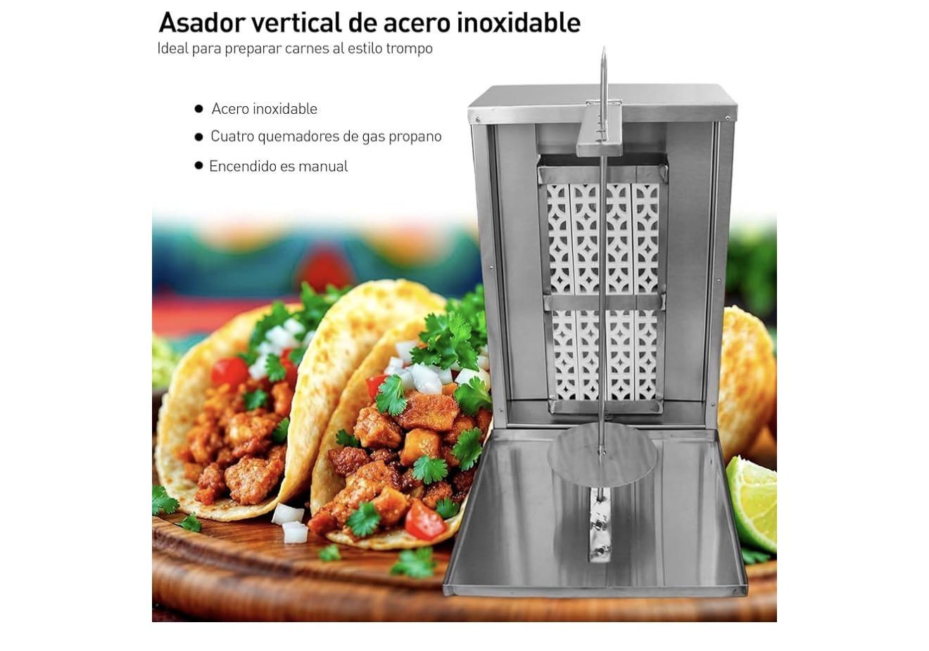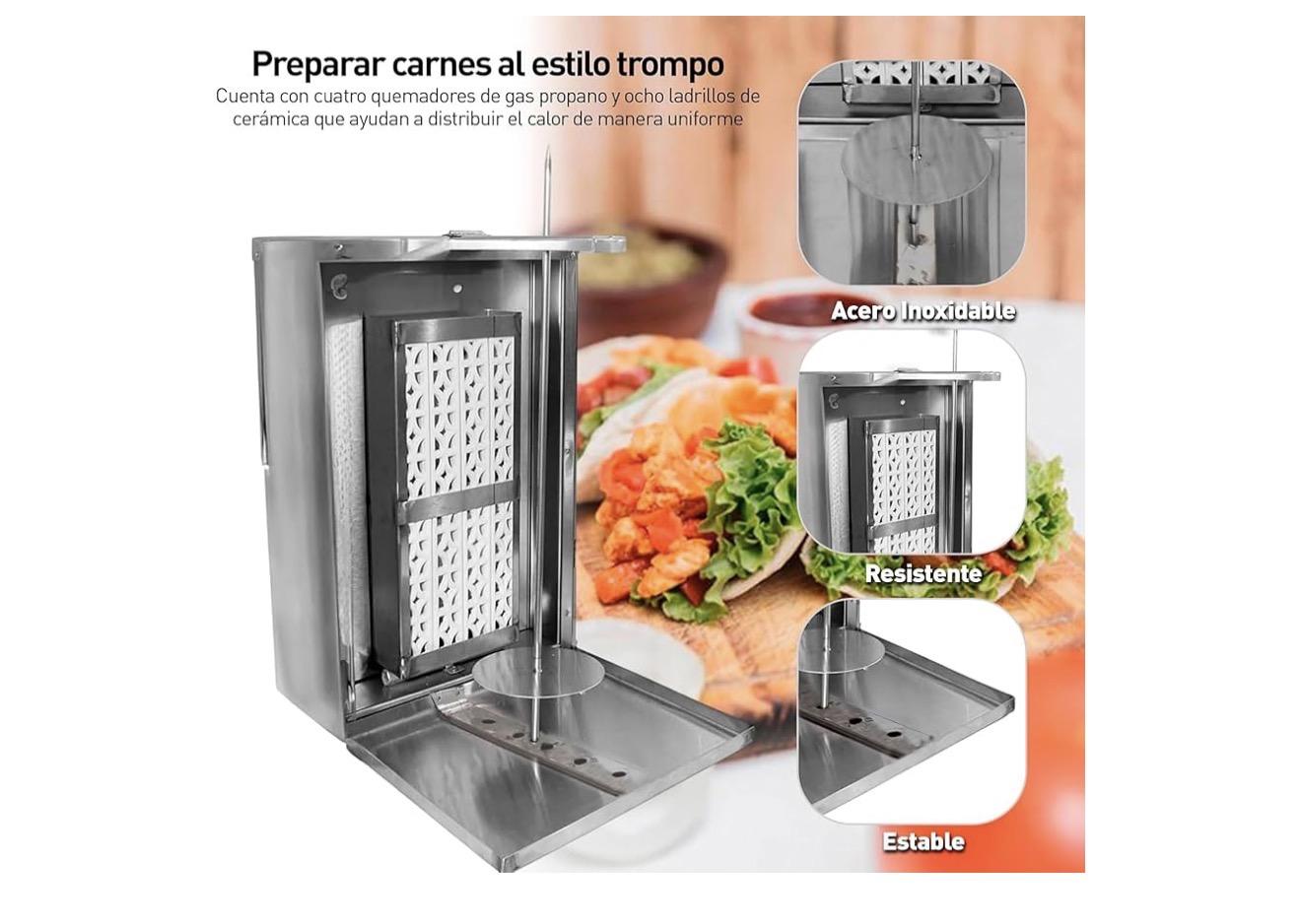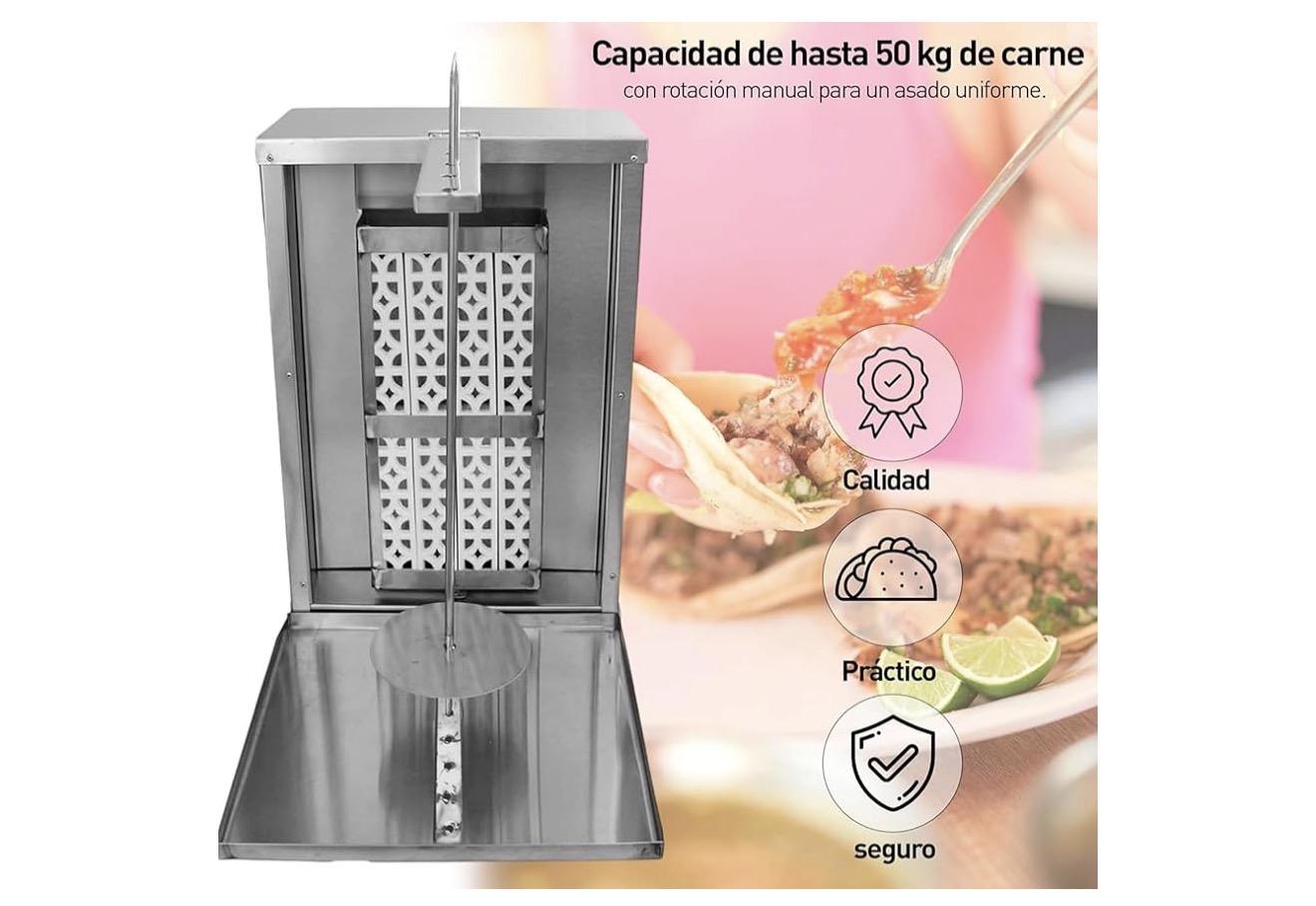 TROMPO PARA TACOS AL PASTOR] Soporta hasta 50 kg de carne, ideal para tacos al pastor, shawarma o kebabs, su estructura robusta garantiza estabilidad y eficiencia, permitiendo una cocción uniforme y facilitando el giro de la varilla para un mejor asado, perfecto para negocios que buscan calidad y alto rendimiento