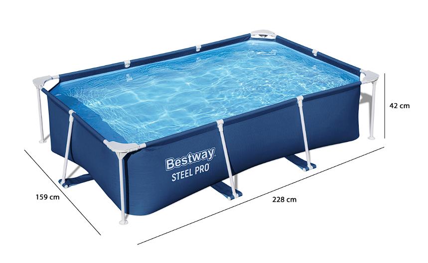 Alberca es el modelo Steel Pro, con una capacidad máxima de 1500 litros. Es de PVC y cuenta con estructura de acero armable, resistente a la corrosión. Además, tiene medidas de 228 x 159 x 42 cm.