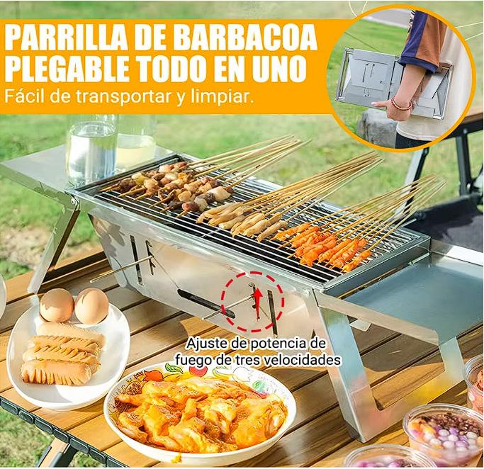 Asador de acero inoxidable, Asador plegable para exteriores, con agarraderas aisladas y charola de carbón ajustable a tres alturas, mini asador para campamentos, patios traseros, parrilladas familiares, apto para 2 a 3 personas.