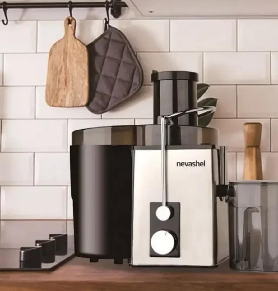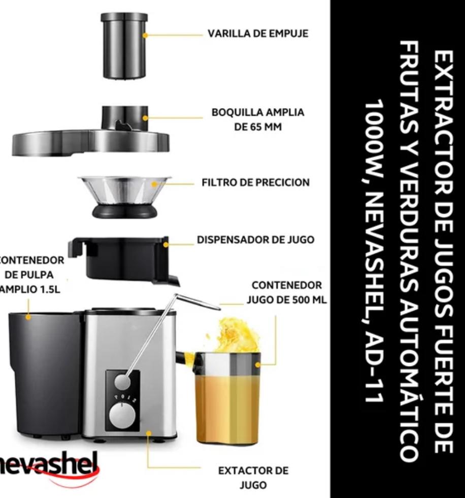 1 unidad extractora Nevashel AD-11, 1 Instructivo, 1 contenedor 550 ml desmontable, 1 rodillo de empuje, 1 tapa compatible con el contenedor