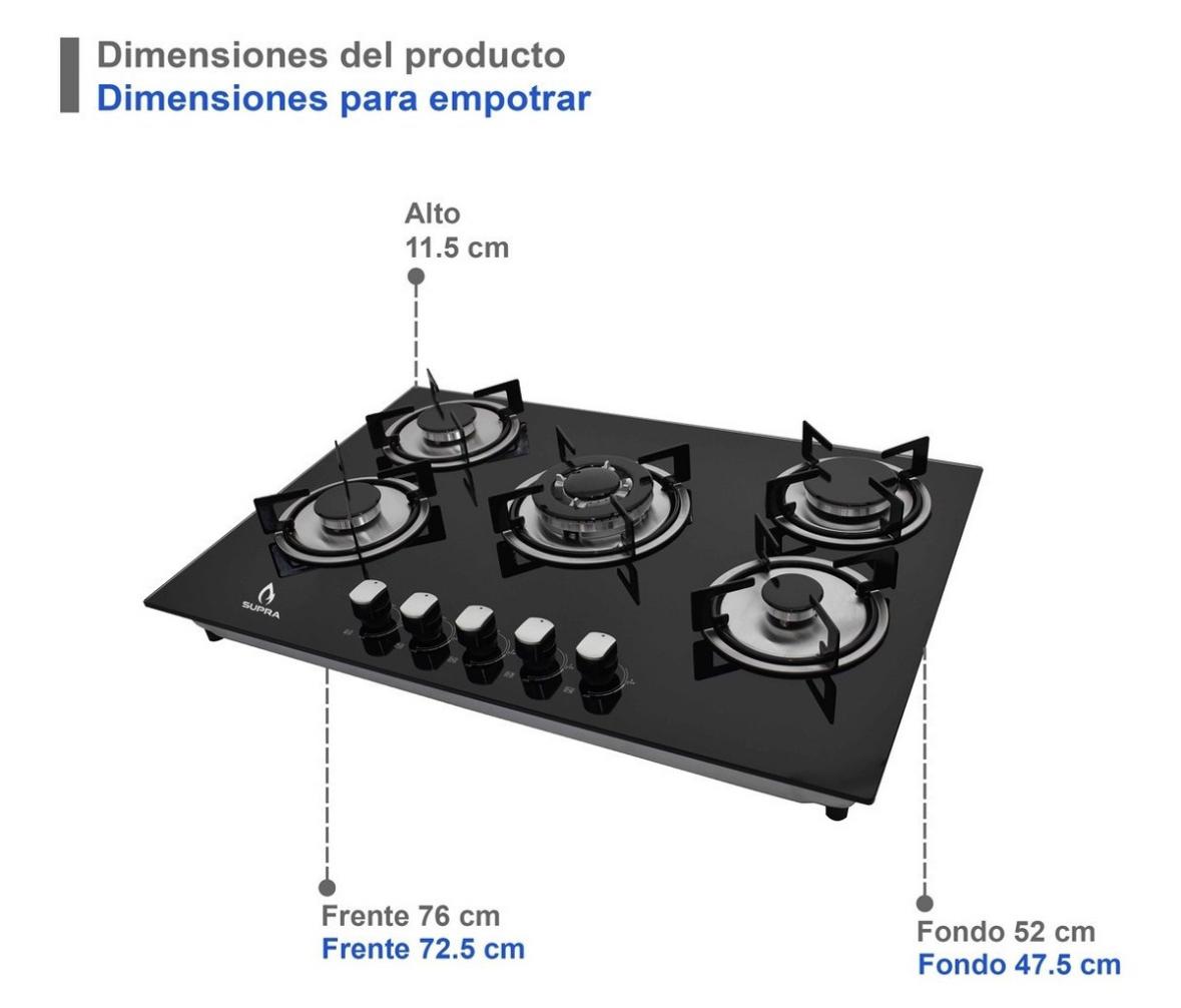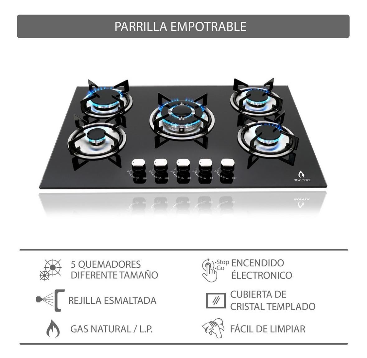 Parrilla de 5 quemadores Supra y campana de pared con 3 velocidades de extracción
