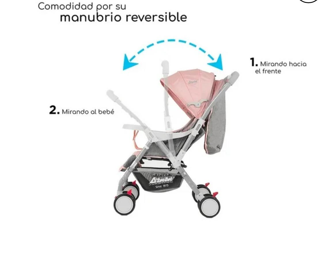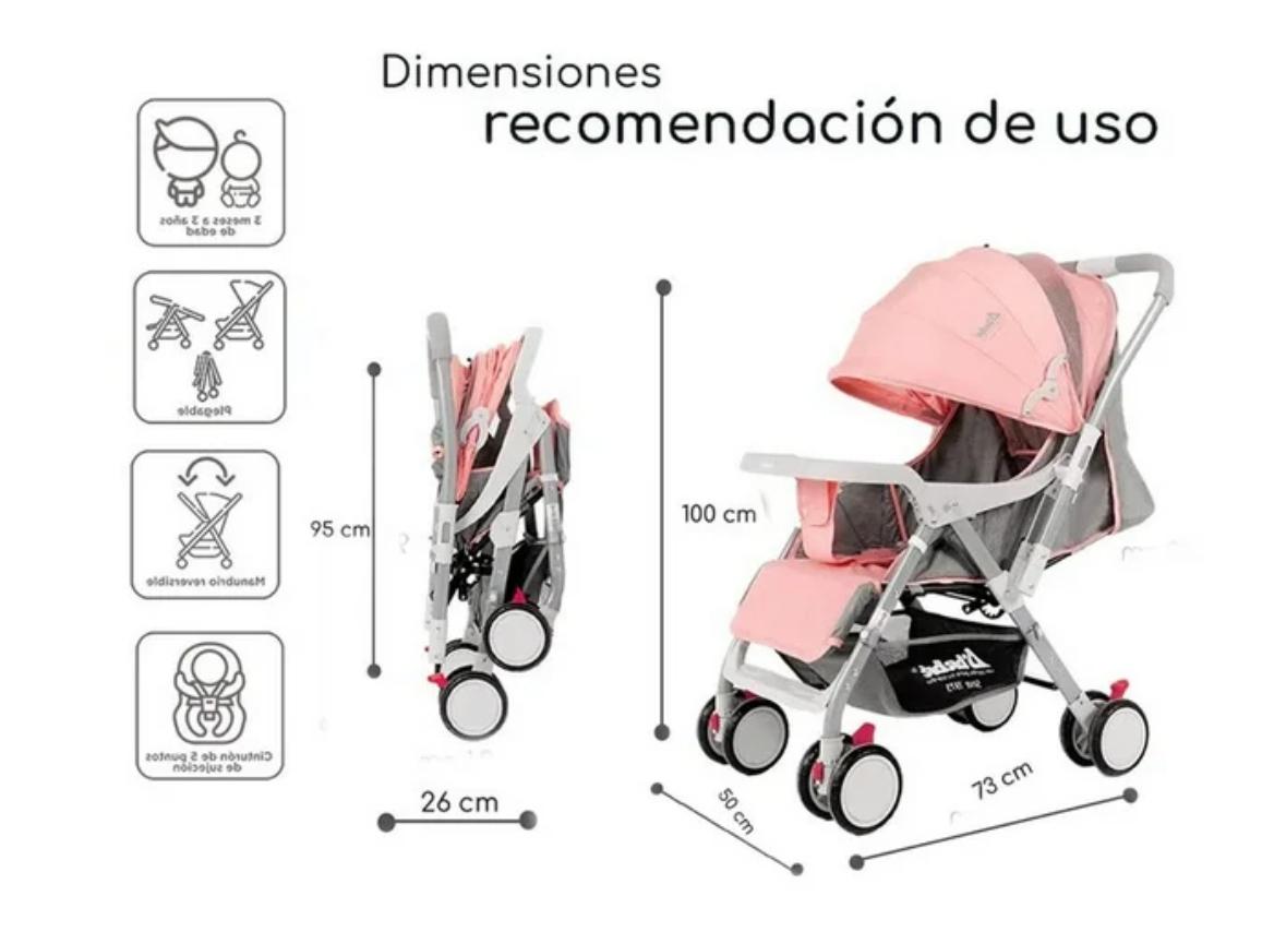 Moderna carriola de manubrio reversible permite tener al bebé siempre a la vista, cómodo asiento reclina fácilmente, repisa al frente para los biberones del bebé, cinturón de 5 puntos de sujeción para la transportación segura de su bebé, canastilla de gran capacidad, freno en todas sus llantas para pasear con seguridad, «cierra fácil» con seguro previene que la carriola se cierre accidentalmente y sea plegada únicamente por un adulto.
