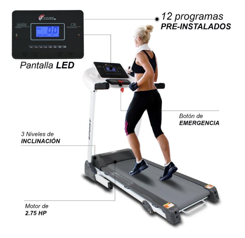 La caminadora CENTURFIT posee un motor de 2 HP, capaz de soportar hasta 110 kg de peso. * La velocidad mínima es de 0.8 km/h y la máxima de 14.8 km/h * La estructura es de metal con monitor de plástico y bocinas frontales. * Cuenta con 12 programas que se configuran a las necesidades del usuario