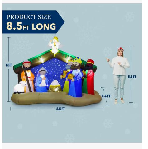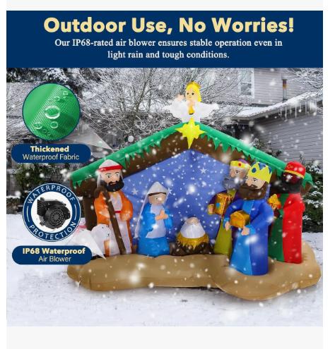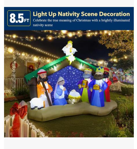 Celebra el espíritu navideño: Sumérgete en la verdadera magia navideña con este belén inflable de 2.4 metros, que presenta a María, José, los Reyes Magos, un ángel y animales reunidos en reverencia. Esta impresionante y conmovedora exhibición, iluminada por brillantes luces LED, trae calidez, alegría y esperanza a tu hogar, creando una pieza central que inspira a tu familia, amigos y vecinos durante toda la temporada navideña.