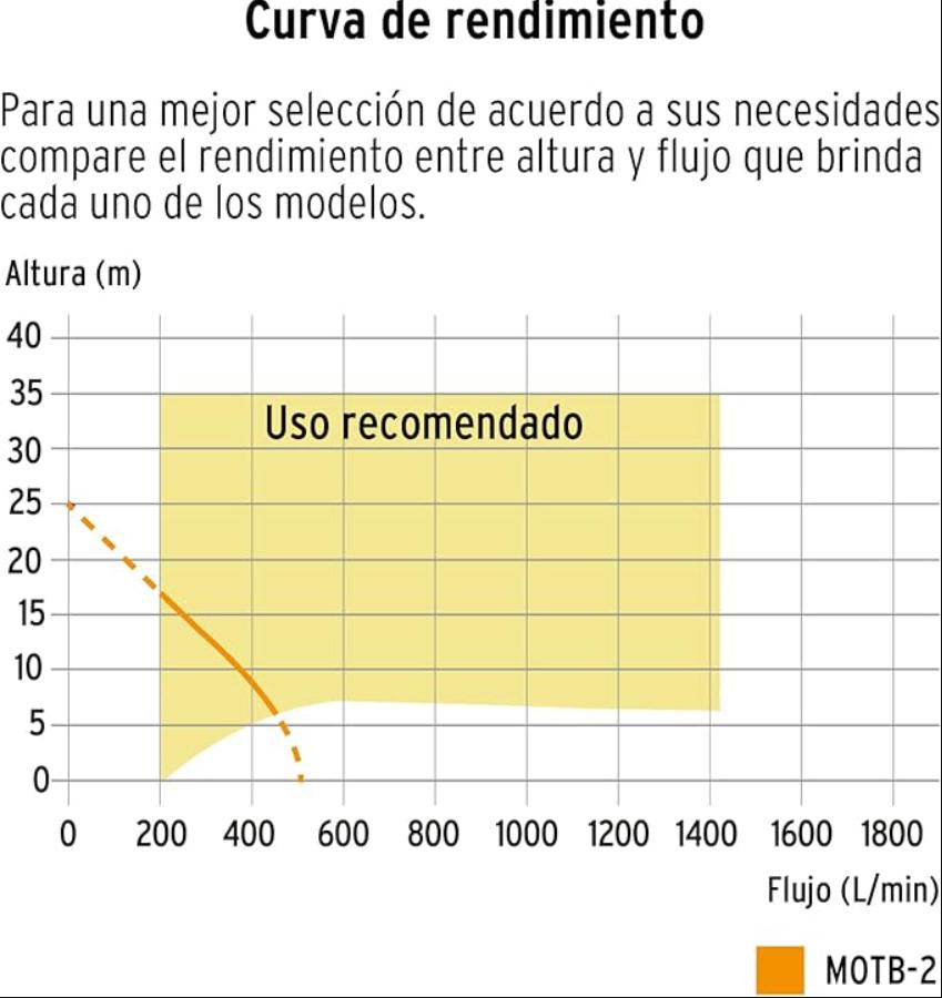Altura máxima de bombeo: 25 m, Flujo máximo: 110 L/min, Máxima profundidad de succión: 8 m