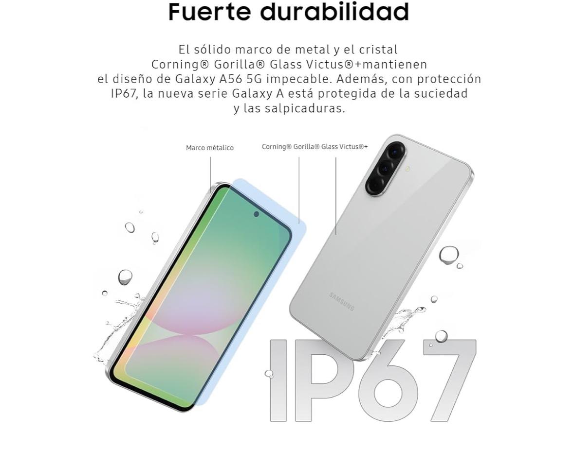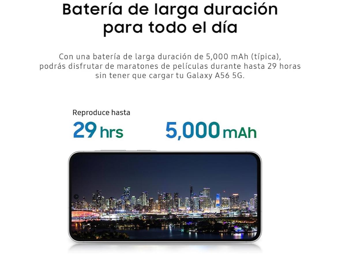 El Samsung Galaxy A56 5G es un dispositivo diseñado para ofrecer una experiencia de usuario excepcional. Equipado con una cámara triple de 50MP, 12MP y 5MP y una pantalla de 120Hz y 6.7” FHD+ sAMOLED proporciona una visualización extrema, ideal para disfrutar de contenido multimedia con una calidad impresionante. La batería de larga duración de 5000 mAh asegura que puedas usar tu teléfono durante todo el día sin preocuparte por la carga, y cuando necesites recargar, la función de carga rápida te permitirá hacerlo en poco tiempo. Además, el Galaxy A56 5G es resistente al agua, ofreciendo protección contra salpicaduras y lluvia, lo que lo hace ideal para usar en cualquier condición climática. Con imágenes nítidas en condiciones de poca luz y retratos mejorados por inteligencia artificial, este teléfono es una excelente opción para aquellos que buscan un dispositivo confiable y de alto rendimiento. El lector de huella digital en pantalla proporciona una seguridad adicional y una forma con