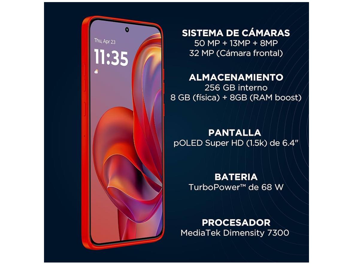 El Motorola Edge 50 NEO es un smartphone de gama alta que ofrece un excelente equilibrio entre precio y rendimiento. Es un celular 5g desbloqueado, de origen nacional y cuenta con 2 años de garantía, lo que brinda tranquilidad al usuario. Con dimensiones de 71,24 mm de ancho, 154,11 mm de largo y 8,09 mm de profundidad, el Motorola Edge 50 NEO presenta un diseño elegante y compacto que se adapta cómodamente a la mano. En términos de rendimiento, este dispositivo cuenta con el sistema operativo Android 14, un potente procesador Mediatek Dimensity 7300 y una generosa memoria RAM de 8 GB. Además, ofrece un amplio almacenamiento interno de 256 GB, lo que te permite almacenar una gran cantidad de aplicaciones, fotos, videos y otros archivos sin preocuparte por quedarte sin espacio. La pantalla del Motorola Edge 50 NEO es de 6.36 pulgadas pOLED (1.5k) y una alta frecuencia de actualización de 120 Hz. Esta pantalla ultra amplia de borde a borde ofrece colores vibrantes y una experiencia visua
